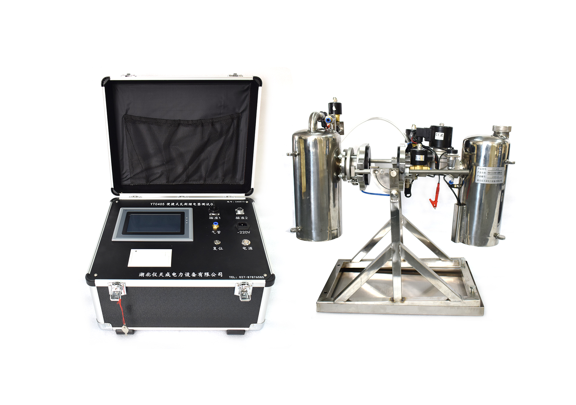 瓦斯繼電器校驗儀主要是由試驗組件和微機測控箱組成,瓦斯繼電保護校驗儀底部設(shè)有接油盤,[可調(diào)支架]裝在油盤內(nèi),支架四角有調(diào)整水平的調(diào)節(jié)螺釘,由[拉桿緊固件]、[主油桶]的組件、[回油桶]的組件,通過[被測繼電器]組成整體,通過拉桿中部的軸承將組裝好的本體支撐在軸承座上,[支架]上有[雙向定位板]的孔和軸承座上的[定位銷]構(gòu)成90°自動定位,由于兩側(cè)重量相近,試驗人員可輕松地將校驗臺旋轉(zhuǎn)至水平或垂直位置。