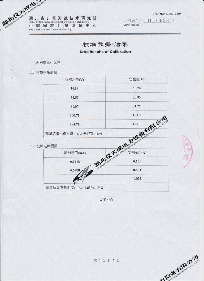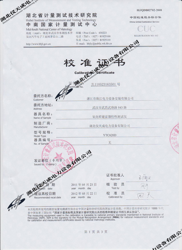 轉載:"YTC620D氧化鋅避雷器特性測試儀的資質證書" 請注明來源于儀天成電力。 更多技術問題請致電儀天成電力客戶服務:027-87876585,技術部專線:027-87876585,在線客服:719388481