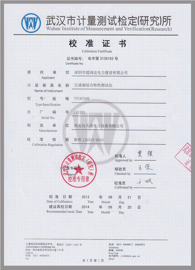 轉載:"YTC8750B互感器伏安變比極性綜合測試儀鑒定證書" 請注明來源于儀天成電力。 更多技術問題請致電儀天成電力客戶服務:027-87876585,技術部專線:027-87876585,在線客服:719388481